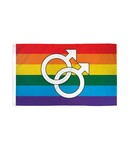 This is a variation of the classic, 6-stripe rainbow pride flag featuring a double Mars symbol at the centre. The symbol is white with a black outline, and stands out clearly against the colours of the flag.