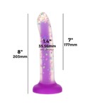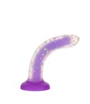 This stunning glow-in-the-dark dildo is poured in dual layers of brightly coloured, glow-in-the-dark silicone, with a purple core surrounded by a translucent outer layer with colourful flecks of silicone suspended within like flying confetti. It has an angled head for G-spot or prostate stimulation, and a smooth shaft with a bendable, posable core. The flared base ensures that the dildo is safe for anal insertion, while the built-in suction cup allows it to be used in an O-ring strap-on harness or stuck to a smooth surface for hands-free play.
